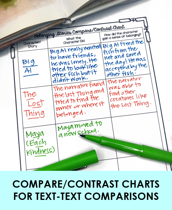 📓 compare and contrast charts to help us identify text-to-text connections among books we read about kindness, courage, or gratitude