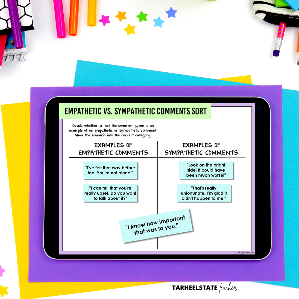 Consider displaying an empathy vs sympathy chart in your classroom to help students remember the difference.
